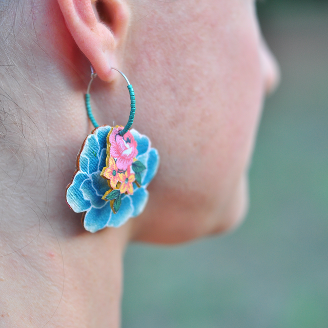 Découvrez un bijou unique de la collection PIVOINE : ces boucles d'oreilles créées par Les Botanes allient un motif de bouquet turquoise en tissus de qualité à l'éclat de perles Miyuki Vertes. Montées sur des créoles de 25 mm en or laminé, elles offrent une qualité supérieure au plaqué or et sont garanties sans nickel, plomb ni cadmium. L'envers en cuir camel apporte une touche finale raffinée à cette création artisanale française.
